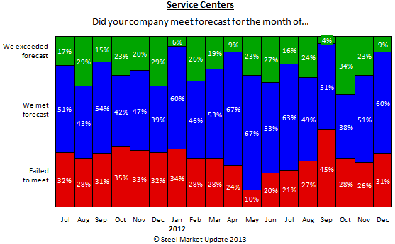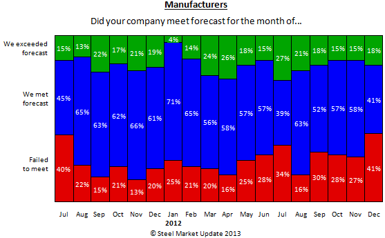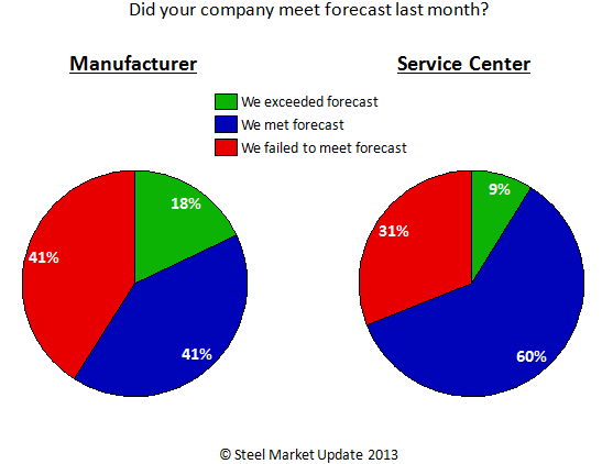 We have begun our first steel market survey for the New Year. Early results are showing December business conditions as having been less than what was expected by both manufacturing companies and the distributors who service those businesses. After two days of collection, our preliminary results are showing 41 percent of the manufacturing companies as reporting their company as not having met forecast for the month. Service centers fared slightly better with 31 percent of those responding to the survey reporting failure to meet their December forecast.
