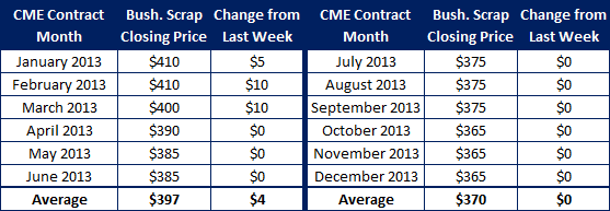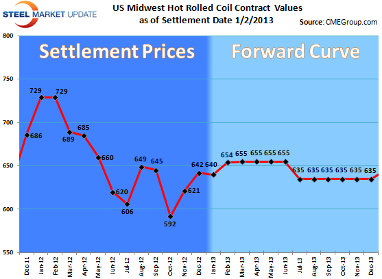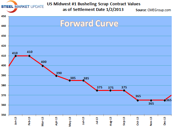 It’s still early yet on the physical scrap market, but early indications are a flat market with some expectation of regional price increases where the river levels have affected shipments. Possibly up $10 or more in those regions. Mini mills order books will drive this of course so the next week to 8 days will be critical to see how buyers operate here in the New Year with the fiscal cliff behind them. Inventories remain modest to healthy with current ship rates. Ship rates will be the key to how buyers likely behave.