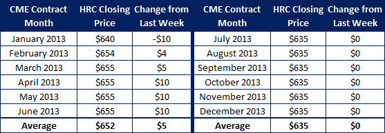 The week has been quiet on HR futures, which were broken up by the holidays. Last week we did a couple Q2 deals and that’s looks like the bulk of what transpired in the week except for some screen trades in Feb ‘13. We had a total of 265 lots trade in the week or 5300 ST. There is upward pressure on the forward curve now about $5-10/ST stronger than we had a couple weeks back.