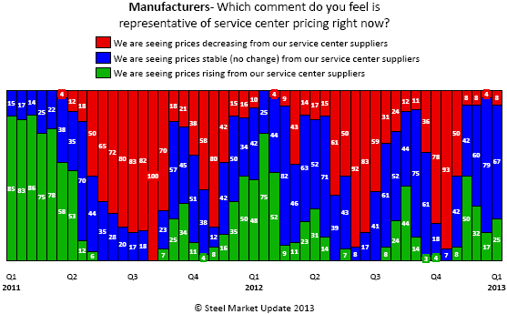 What is interesting is to compare the results from our latest survey against the past two beginning of the year cycles to see how they compare. During the beginning of 2011 the steel industry went through a very strong spot market and pricing cycle and at the time manufacturing companies were consistently reporting throughout the entire first quarter higher spot prices from the service center segment of the industry. During the first week of January 2011, 85 percent of the manufacturing companies reported service centers as raising spot prices.
