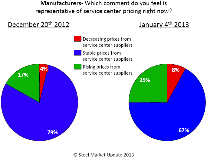 What is interesting is to compare the results from our latest survey against the past two beginning of the year cycles to see how they compare. During the beginning of 2011 the steel industry went through a very strong spot market and pricing cycle and at the time manufacturing companies were consistently reporting throughout the entire first quarter higher spot prices from the service center segment of the industry. During the first week of January 2011, 85 percent of the manufacturing companies reported service centers as raising spot prices.