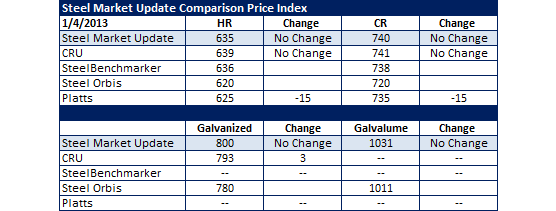 Platts may be providing a hint as to what we will see coming from the other indices as we enter a full week. SMU did see weakness in our steel survey but we have decided not to make any adjustments in our index until Tuesday evening since last week was 1) a short week and, 2) the first week back from holiday. Steel Orbis and SteelBenchmarker were both silent and CRU only had minor adjustments.