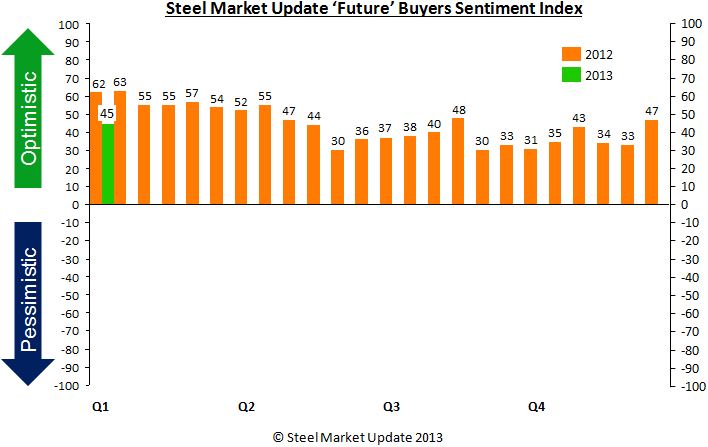 After months of uncertainty related to governmental policies and the fiscal cliff negotiations (or lack thereof) combined with normal end of the year seasonal factors, steel buyers and sellers finished 2012 in the Optimistic range of the SMU Steel Buyers Sentiment index. During the first week of 2013 those same buyers and sellers were slightly less optimistic than they were during the middle of December as our SMU Steel Buyers Sentiment Index was measured at +21, down 7 points from the mid-Decemberwas measured at +21, down 7 points from the mid-December level. Compared to one year ago, Sentiment is 20 points lower than the +41 reported at this time last year.