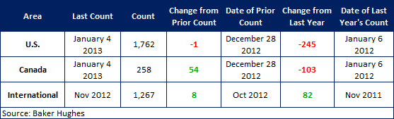 According to Baker Hughes data from January 4th, 2013, the U.S rig count for this week is 1,762 rigs exploring for or developing oil or natural gas. This number represents a decrease of 1 rig from last week. Compared to last year the 1,762 count is a decrease of 245 rigs. Canadian rigs increased by 54 to 258 rigs this week, a decrease of 103 rigs from a year ago. International rigs increased by 8 to 1,267 rigs last month, an increase of 82 rigs from a year ago.