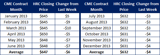 Below is a table with yesterday’s HRC futures settlement prices on the CME contract for each individual month through Q2 2013 as of 1/9/2013 close: