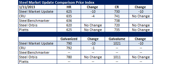 At the moment we have broken into two camps when it comes to hot rolled coil – the CRU and SteelBenchmarker (which did not report prices this past week) who both pegged their HRC prices in the mid-$630’s – and the rest of the indexes we follow on a regular basis and ourselves (SMU) who are in the low to mid $620’s. The tightest spread is on Galvalume at $10 per ton. As you can see by the table below many of indices reported no change to their assessments this past week.