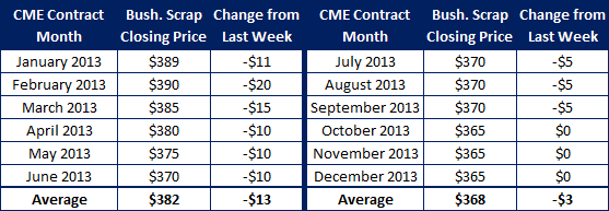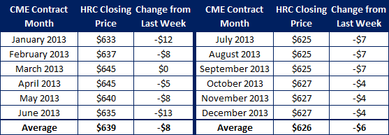 We had a healthy week in the Futures market having traded 916 lots or 18,320 ST. Most of the activity has been for the first three months all of which have been bid. This activity appears to have little to do with the underlying steel market in the US and more to do with financial trading strategies. While the nearby months have traded a touch higher by about $5/ST, the Q3 period has traded about $5/ST lower. The CRU this week came in at $624 down $11/ST. Expectations are that we will see at least a couple more prints lower if not a few before any recovery. The mills will want to try and raise prices, but the inventories at 3.4 months of inventory on hand is not helping the situation as buyers look to be back in control for now.