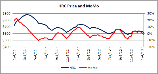 MoMo is based upon the current hot rolled coil price weighed against the previous 12 week average spot price as recorded by Steel Market Update. MoMo, as we like to call it so as to not confuse it with our SMU Price Momentum Indicator, was measured at -1.06 percent this week. MoMo decreased 1.06 percent over last week’s measurement of 0.00 percent. The graph below demonstrates the relationship between hot rolled coil and the momentum in pricing.