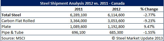 Canadian distributors did not fare as well as their southern counterparts as total steel shipments declined from 6,289,100 tons in 2011 to 6,114,600 tons (-2.77 percent) during 2012.