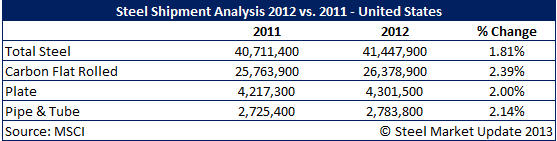Flat rolled shipments also rose during 2012 totaling 26,378,900 tons which represents an improvement of 2.39 percent over the previous year. Plate shipments were up by 2 percent, while pipe and tube rose by 2.14 percent.