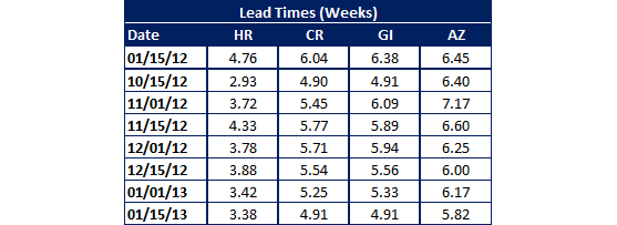 Based on the weighted results from our most recent steel survey which was conducted this past week, SMU found lead times slipping slightly on all flat rolled products followed by our company. Benchmark hot rolled average lead times declined to 3.38 weeks and are much shorter than the 4.76 weeks measured by the SMU survey during the middle of January one year ago. We found similar situations with cold rolled, galvanized and Galvalume – all of which have shorter lead times than the prior week as well as one year ago.