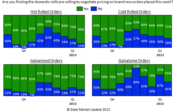The net result of the shorter lead times is shown in our negotiation comparison graph – again, based on the results of this past week’s survey our respondents advised SMU that the domestic mills were more willing to negotiate hot rolled, cold rolled, galvanized and Galvalume pricing this past week than they were during the first week of January.