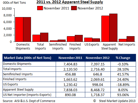 November apparent steel supply grew by 8 percent year-over-year to 8,468,720 tons. Imports were up by 28 percent (semi-finished being a major piece up 41.57 percent) while exports shrunk by almost 19 percent to just under 1,000,000 tons (998,040 tons).