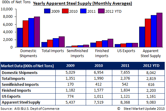 The United States increased its imbalance as a net importer (YOY) has grown apparent steel supply by 8 percent, semi-finished by 41.57 percent but overall our import imbalance grew by 93.06 percent.