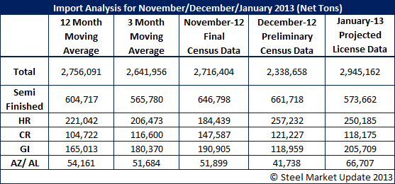 Imports dropped by 377,746 net tons compared to the prior month. On a day’s adjusted basis December imports were 15 percent lower than November. Based on preliminary license data January imports are projected to be approximately 2.9 million net tons – well above both the 3-month and 12-month moving average.
