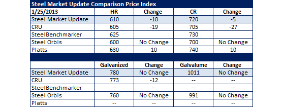 With the exception of Steel Orbis (which if you haven’t noticed tends to take few positions on a weekly basis) and SteelBenchmarker who did not produce new numbers this past week, CRU and SMU both dropped HRC price assessments by double digits by the middle of the week. By the end of the week, Platts reversed course and moved their HR and CR assessments higher by $10 per ton (assuming due to the mill price announcements).