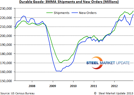 Shipments have been up five of the last six months and increased 1.3 percent to $230.6 billion. Primary metals had the largest increase, up 4.2 percent to $30.7 billion.
