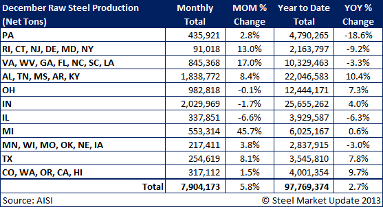 December 2012 production was reported by the AISI to have been 5.8 percent higher than November 2012 raw steel production.