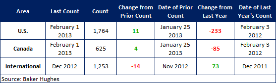 According to Baker Hughes data from February 1st, 2013, the U.S rig count for this week is 1,764 rigs exploring for or developing oil or natural gas. This number represents an increase of 11 rigs from last week. Compared to last year the 1,764 count is a decrease of 233 rigs. Canadian rigs increased by 4 to 625 rigs this week, a decrease of 85 rigs from a year ago. International rigs decreased by 14 to 1,253 rigs last month, an increase of 73 rigs from a year ago.