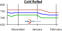 Cold Rolled Coil: SMU Price Range is $700-$740 per ton ($35.00/cwt-$37.00/cwt) with an average of $720 per ton ($36.00/cwt) fob mill, east of the Rockies. Both the lower and upper end of our range remained the same as one week ago. Our average also remained the same as it was one week earlier. The trend for CR is neutral as we watch how the market will react to the decline in scrap prices while the domestic mills push for higher steel prices.