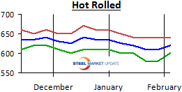 The bottom end of our range exhibited some “tightening” over the past week – although not as much as one might expect in light of the size of the price increase announcements made by the domestic mills. Based on survey results the bottom end of the range for our benchmark hot rolled coil is no longer below $600 per ton. In fact, with the exception of cold rolled, each of the products we provide price assessments has seen the bottom end of their range rise modestly over the past week and, in some cases, we have also captured a very modest increase in the upper end of our range as well.