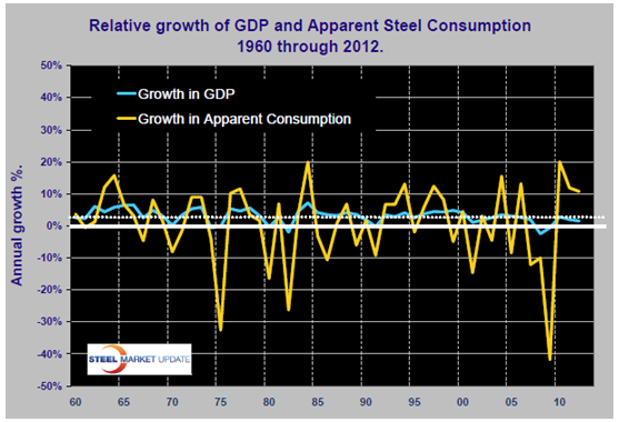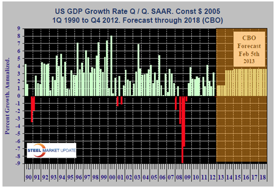 In the last 52 years – since 1960 there has been an over-riding relationship between the growth of apparent steel consumption and the growth of GDP. This indicates that in the very long term it is necessary to achieve about a 2.5 percent growth in GDP to get any growth in steel consumption. However steel is very much more volatile than GDP as shown in Figure 2. The dotted line represents the level of GDP that has to be exceeded to get any growth in steel consumption in the long term. In recent years steel growth has been much higher than the long term relationship would suggest and this will continue for several more years as we recover from the disastrous year of 2009. If the CBO is correct in its February 5th analysis then steel consumption will get an additional boost from GDP over and above the recovery effect through 2018.
