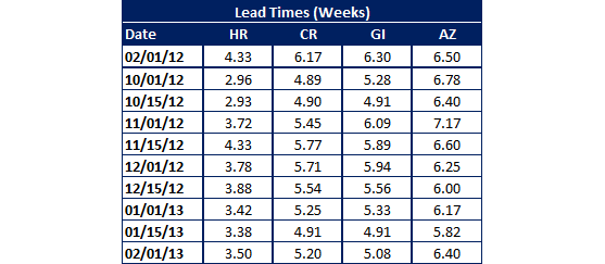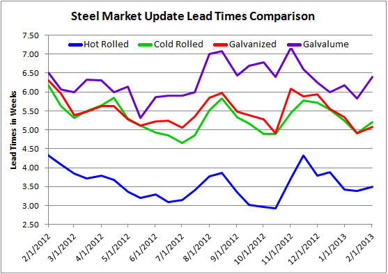 Based on the results of this week’s SMU steel market survey, lead times have moved out slightly at the domestic steel mills compared to where they were during the middle of January. We are now seeing hot rolled lead times averaging 3.5 weeks, cold rolled and galvanized at just over 5 weeks and Galvalume at almost 6.5 weeks. With the exception of Galvalume – HR, CR and GI are still well behind where their lead times were at this time last year (see table below and graph at the end of this article).
