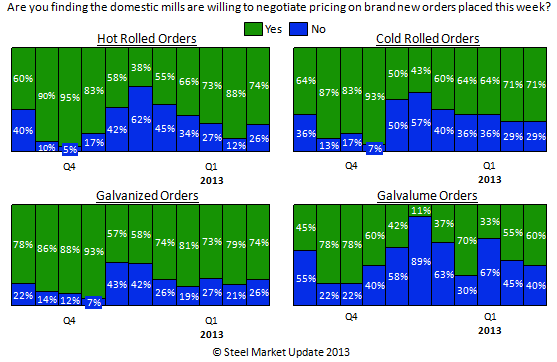 Even with the domestic mills having hiked prices by $40 to $50 per ton over the past few weeks their sales people continue to negotiate pricing with their customers – according to the results from our survey which concluded this afternoon. The only item where we found any significant drop was hot rolled – from 88 percent to 74 percent – in other words during the middle of January 88 percent of those responding to our survey reported the domestic mills are willing to negotiate hot rolled pricing. This week that number has dropped to 74 percent. As you can see by the graphic below – all of the other flat rolled items continue to have a significant amount of “discussion” associated with the placement of any new orders.