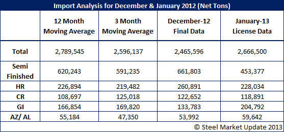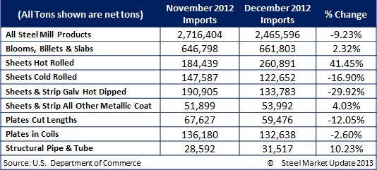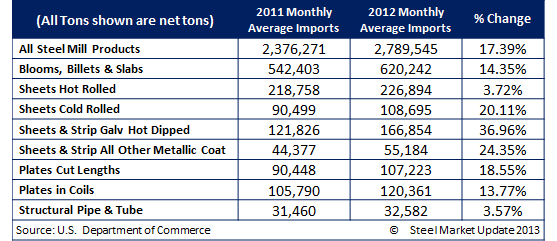 Total imports during 2012 rose by 17 percent and every product we watch on a regular basis was higher year-over-year (YOY). Hot rolled was the least affected product while hot dipped galvanized was the most impacted, up 37 percent YOY.
