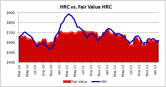 This week, the SMU Fair Value HRC (hot rolled coil) Model has spot HRC pricing above Fair Value for the first week after three consecutive weeks of being below the Fair Value price. This is due to the SMU average spot HRC index increasing $10 to $620 per ton and scrap inputs slightly decreasing $5 to $10 per ton. The Fair Value model now shows HRC prices $4 above the estimated Fair Value price.
