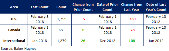 According to Baker Hughes data from February 8th, 2013, the U.S rig count for this week is 1,759 rigs exploring for or developing oil or natural gas. This number represents a decrease of 5 rigs from last week. Compared to last year the 1,759 count is a decrease of 230 rigs. Canadian rigs increased by 6 to 631 rigs this week, a decrease of 78 rigs from a year ago. International rigs increased by 26 to 1,279 rigs last month, an increase of 108 rigs from a year ago.