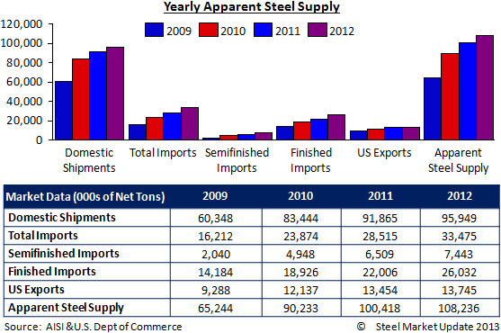 Apparent steel supply grew by 7,818,000 tons during 2012. The domestic industry saw gains in domestic shipments of 4,084,000 tons. Semi-finished imports increased by 934,000 tons while finished imports rose by 4,026,000 tons. Exports also gained slightly over the prior year by 291,000 tons.