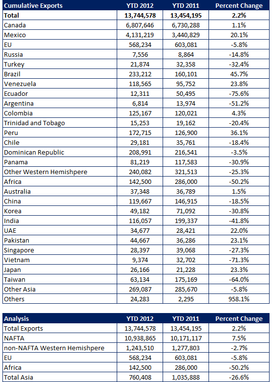 Total Steel exports in December 2012 were 968.990 thousand tons compared to 998.022 thousand tons in November 2012, a 2.9 percent decrease, and a 19.3 percent decrease compared to December 2011. For the year-to-date period, total exports increased from 13.454 million tons in 2011 to 13.745 million tons in 2012 period, a 2.2 percent increase. (Source: AIIS Press Release – Including Tables Below)