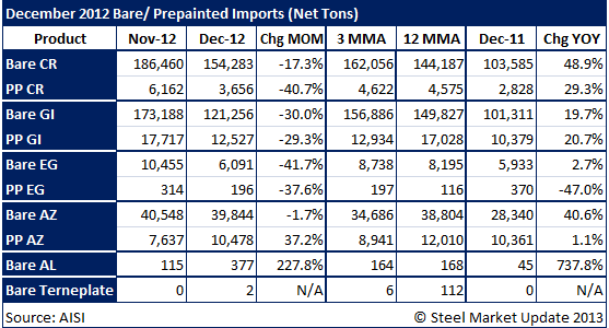 The following table shows bare and prepainted cold rolled, galvanized, electro-galvanized, Galvalume, bare aluminized and bare Terneplate imports for the month of December 2012. We show the comparison to November 2012 and the three-month moving average (3MMA) and twelve-month moving average (12MMA) with the change year-over-year (YOY).