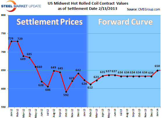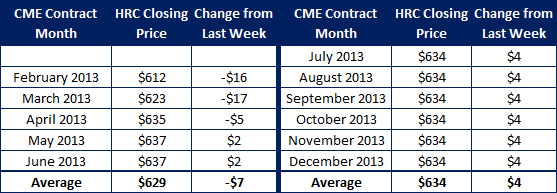 Below is a table with yesterday’s HRC futures settlement prices on the CME contract for each individual month through Q2 2013 as of 2/13/2013 close: