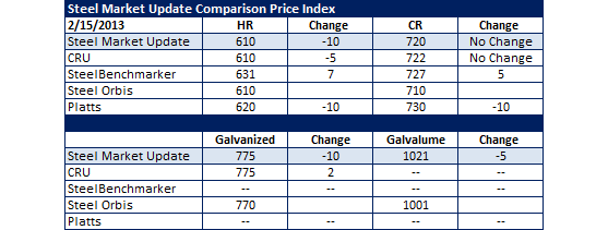 With the exception of SteelBenchmarker which only produces pricing twice per month, the rest of the indexes followed by Steel Market Update were bunched fairly closely together. Hot rolled coil price assessments were reported at $610 by three – SMU, CRU and Steel Orbis while Platts was at $620 and SteelBenchmarker at $631. Many of the indexes reported single digit price adjustments and the market continues to operate without a clear direction