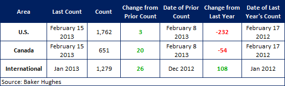 According to Baker Hughes data from February 15th, 2013, the U.S rig count for this week is 1,762 rigs exploring for or developing oil or natural gas. This number represents an increase of 3 rigs from last week. Compared to last year the 1,762 count is a decrease of 232 rigs. Canadian rigs increased by 20 to 651 rigs this week, a decrease of 54 rigs from a year ago. International rigs increased by 26 to 1,279 rigs last month, an increase of 108 rigs from a year ago.