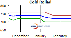 Cold Rolled Coil: SMU Price Range is $700-$740 per ton ($35.00/cwt-$37.00/cwt) with an average of $720 per ton ($36.00/cwt) fob mill, east of the Rockies. Both the lower and upper end of our range remained the same as one week ago. Our average also remained the same as it was one week earlier. The trend for cold rolled remains stuck in a “weak” neutral as prices drift based on the weekly needs of the domestic steel mills. At the moment, we do not see anything which will “push” prices firmly in one direction or another and we anticipate this drift to continue into early March.