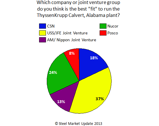 During our mid-February steel survey we asked those taking the survey which company (or joint venture group) was the best “fit” for the Calvert, Alabama facility of ThyssenKrupp Steel? Here are the non-binding opinions of the first two days of our survey: