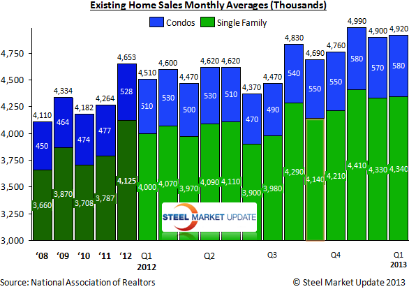 Existing single-family homes rose 0.2 percent to a seasonally adjusted annual rate of 4.34 million and 8.5 percent above January 2012 levels. Condos and co-ops rose 1.8 percent to an annualized pace of 580,000, 13.7 percent higher than a year ago.