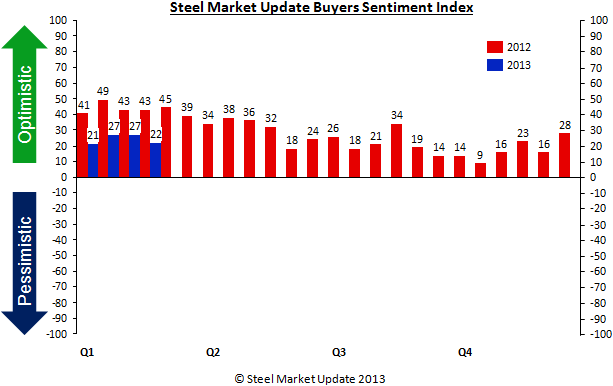SMU Steel Buyers Sentiment Index was measured at +22 this week, down 5 points from the +27 we reported at the beginning of the month. Our Sentiment Index is finding the flat rolled steel community as being slightly less optimistic – but still in the optimistic range of our index. The monthly average is +24.5, a half point higher than the monthly average of January 2013.