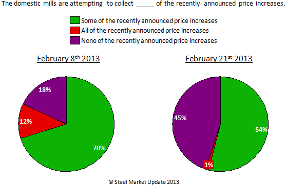 The reason why our Indicator did not revert to Higher after the price announcements can be seen when comparing the early February results to last week. The percentage of companies reporting paying some (or all) of the increase, dropped from 82 percent to 55 percent. SMU cannot move our indicator to Lower as there are still 55 percent who are reporting having paid more for their steel since the increase announcements were made. There is an obvious ongoing struggle which will be resolved when either demand improves (most likely through the reduction of inventories creating a need to purchase) or the supply/demand balance is disrupted through the removal of excess supply from the market.
