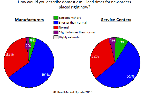 SMU needs to see the blue and green areas of these two pie charts shrink before our SMU Price Momentum Indicator can move in an optimistic way (for the domestic steel mills). At the moment, the data is leaning toward prices falling with the majority of both manufacturing companies and service centers reporting lead times as shorter than normal or worse- extremely short.