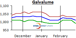 Galvalume Coil: SMU Base Price Range is $35.00/cwt-$37.00/cwt with an average of $36.00/cwt plus applicable extras, fob mill, east of the Rockies. The lower end of our range dropped by $20 per ton while the upper end of our range remained intact when compared to one week ago. Our average is now $10 per ton less than one week ago. The trend for Galvalume remains stuck in a very weak Neutral even as prices slip and slide lower. The attempt by U.S. Steel today may stop the slide but we will not know for sure for a few weeks as we wait for the other mills and the buyers to react to USS action.