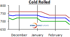 Cold Rolled Coil: SMU Price Range is $680-$720 per ton ($34.00/cwt-$36.00/cwt) with an average of $700 per ton ($35.00/cwt) fob mill, east of the Rockies. The lower end of our range dropped by $20 per ton as did the upper end of our range when compared to one week ago. Our average is now $20 per ton less than one week ago. The trend for cold rolled remains stuck in a very weak Neutral even as prices slip and slide lower. The attempt by U.S. Steel today may stop the slide but we will not know for sure for a few weeks as we wait for the other mills and the buyers to react to USS action.