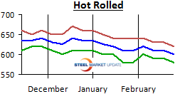 The loss of control appears to have affected spot market pricing this week and may explain why U.S. Steel made their price increase announcement earlier this afternoon. Steel prices have gone from slowly drifting to slipping and sliding lower. Here is how Steel Market Update saw prices this week:
