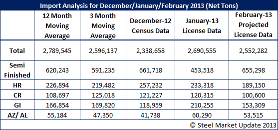 Total Steel imports in January 2013 were 2.579 million tons compared to 2.466 million tons in December 2012, a 4.6 percent increase, and an 8.4 percent decrease compared to January 2012. The data show that imported semifinished products decreased by 2.8 percent in January 2013 compared to January 2012, from 487 thousand tons in 2012 to 473 thousand tons in 2013, based on preliminary reporting. (Source: American Institute for International Steel)