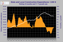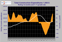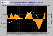 Monthly data is notoriously erratic and usually should be considered as a three month moving average, (3MMA). In the case of construction, seasonality is also has a very strong influence. Seasonality can be removed by comparing data year over year on 3MMA and 12MMA bases. The next step is to compare the three and twelve month year over year growth rates. If the growth of the 3MMA is stronger than the 12MMA, the situation is improving and momentum is positive. The reverse indicates negative momentum.