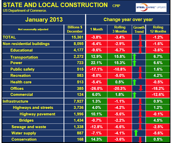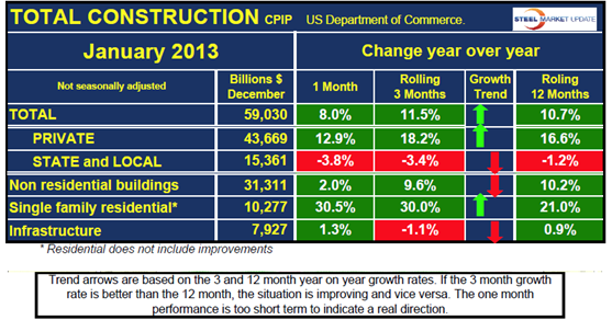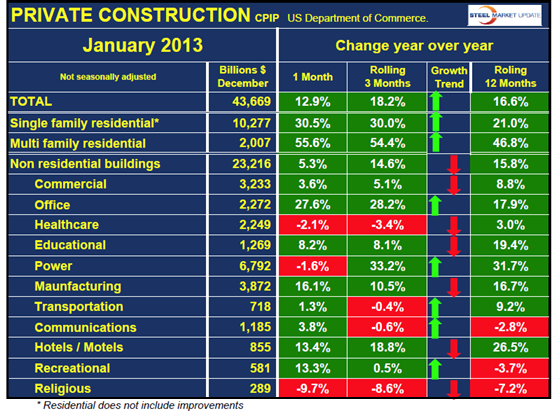 Table 1 gives a breakdown of total construction into public and private and identifies three of the major categories. These are non residential buildings, single family residential and infrastructure. The growth trend arrows reflect the difference between the 3 and 12 month year / year growth rates. A green arrow indicates positive momentum and red negative. Total non residential building, public plus private grew at 9.6% in the last three months y/y but both sectors are slowing. Residential construction is booming and accelerating led by multi family. The 12 month growth rate of infrastructure has been almost flat-lined for the last six months. Table 2 shows the detail of private construction by project type. Residential construction is the highlight of this sector, particularly multi-family which grew at an annualized rate of 46.8% in the last 12 months and is accelerating. This we believe to be key to the economic recovery as it indicates that personal deleveraging is waning and consumer wealth in terms of household equity is recovering. This will drive personal consumption in 2013 and beyond, will power the economic recovery and promote the growth of steel consumption. By sector, Table 2 shows five non residential building sectors to be accelerating and seven decelerating.