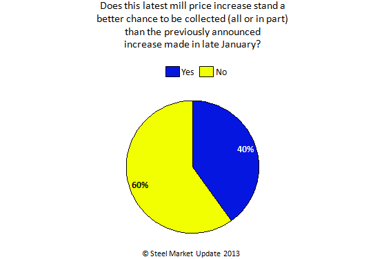 Steel Market Update began our early March steel market survey on Monday morning. One of the areas we probed was that of the recent price increases and if they would be collected (all, or in part) from steel buyers. We wanted to know if the new price increase stood a better chance at being collected than the previous announcement. After two days our survey has been running a very consistent response ratio with 60 percent of those taking our survey responding the mills would not be more successful in collecting this increase than the last and 40 percent believing they will.